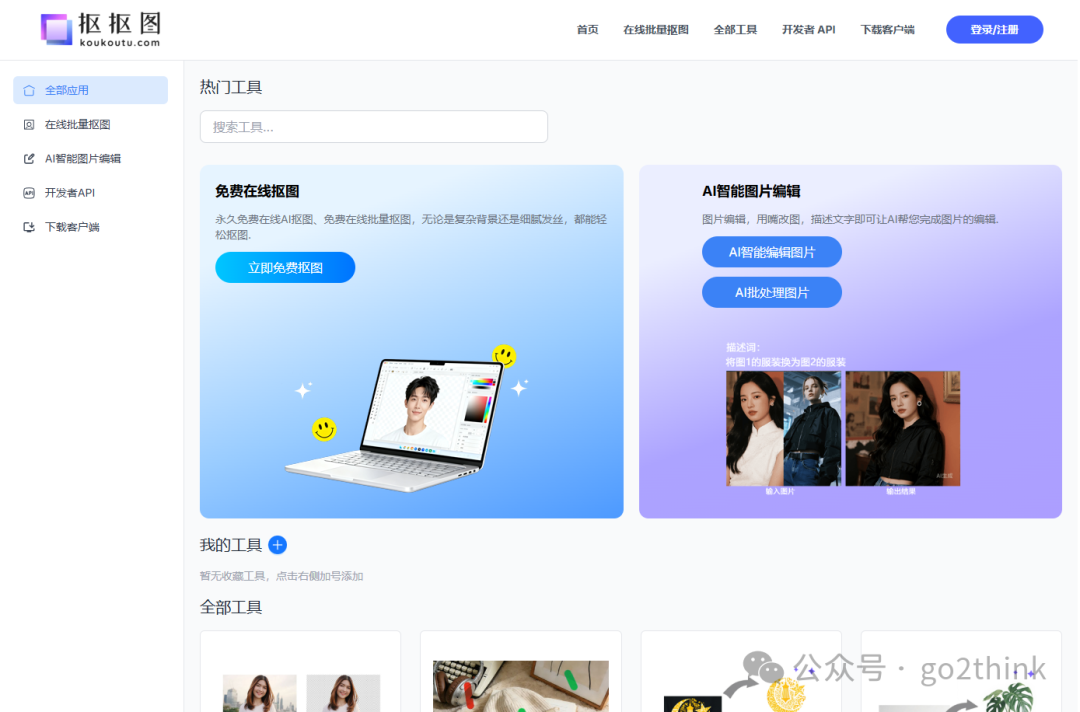 2、抠抠图 https://www.koukoutu.com/?v=xhpt.AI一个免费在线AI抠图神器。 抠图功能永久免费,主打精准抠图,复杂的背景和发丝也能轻松识别。 支持在线免费AI抠图和批量抠图,最多支持一次上传 100 张图片。  上传图片后自动处理,3s 快速出图,一键下载高清原图。 还支持手动模式和高级编辑,可以对抠图范围进行自由调整。 更换背景、插入图标/文本、修改尺寸、修改背景、大小等,非常强大。