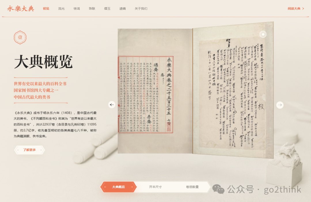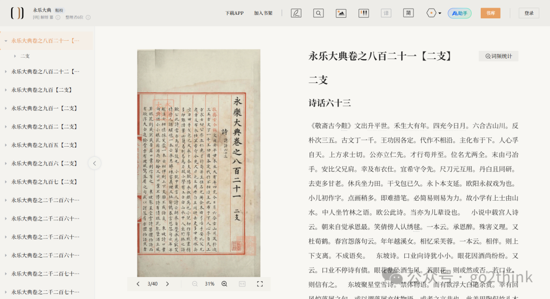 7、永乐大典 https://yongle.shidianguji.com 由国家图书馆出版社建设的《永乐大典》高清影像数据库,是2021年国家古籍数字化工程首批立项项目。 收录了国家图书馆藏《永乐大典》四十册、七十五卷,共涉及14个韵部、17个韵字、1800部书。  网站包含了丰富的《永乐大典》高清图像、整体风貌及相关知识,方便我们了解和阅读这一部鸿篇巨作。
