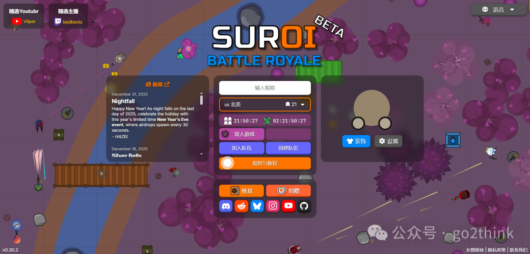 https://suroi.io 一款好玩的在线2D大逃杀游戏。 支持单人游戏和联机游戏,打开后右上角切换为中文,然后输入用户名,选择服务器地区,就能自动匹配玩家开始游戏了。  无需下载安装,浏览器打开就能玩。 游戏还会根据节日更新不同的地图、玩法、稀有物品等,可玩性很高。  使用键盘鼠标操作: