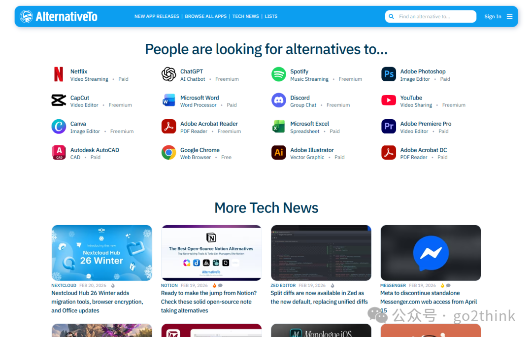 4、AlternativeTo https://alternativeto.net AlternativeTo 是一个同类可替代 软件搜索推荐平台,能帮我们找到目标软件的最佳替代品。 不仅有电脑软件,手机应用和在线 网站也可以搜索到,非常强大。  软件页面标注了详细的介绍、支持平台、官网和类似软件、用户评价等。 找一些付费软件的免费平替品,或者在用软件的更好选择很不错。