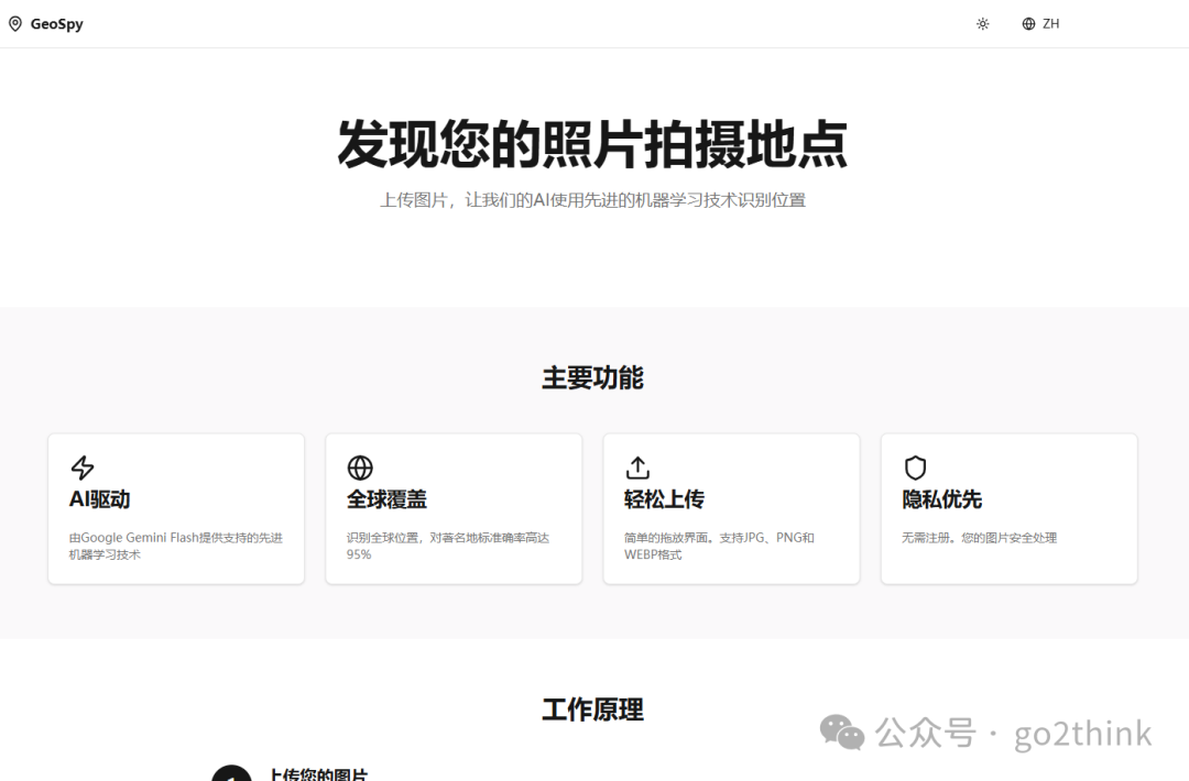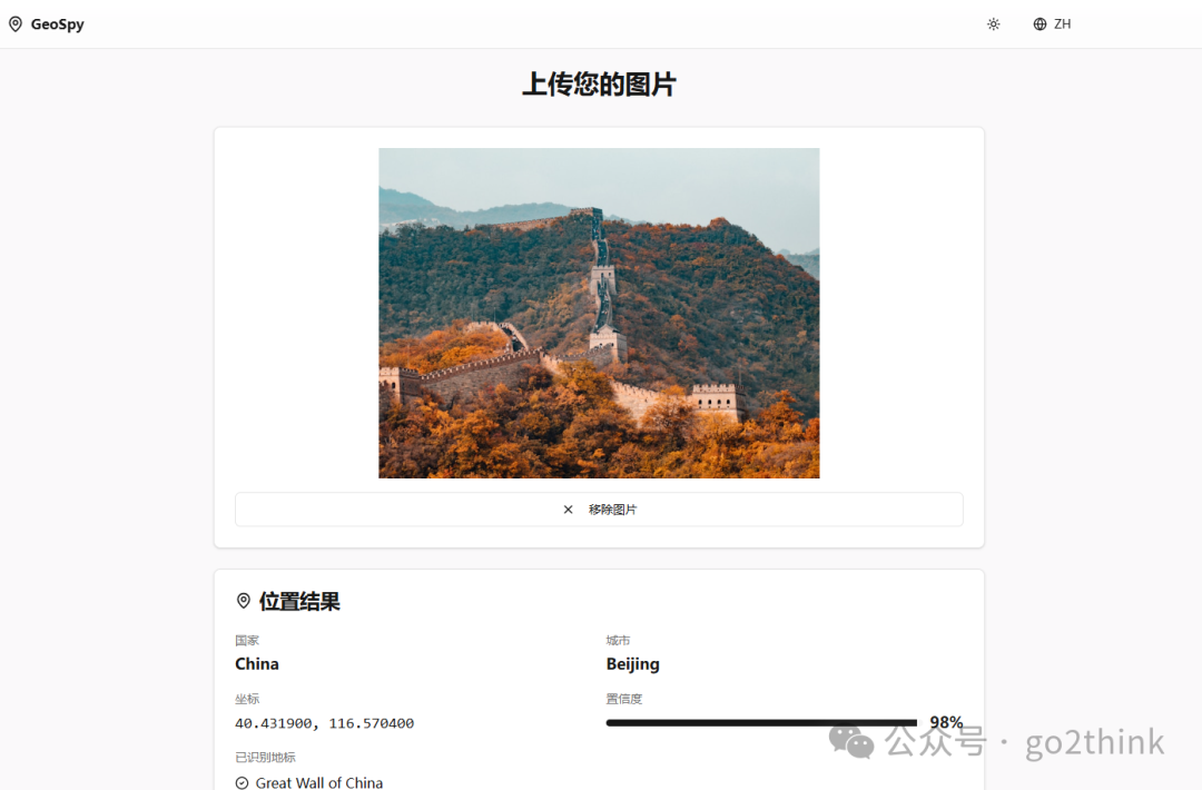 3、GeoSpy https://www.geospy.info/zh  上传照片后,由 Google Gemini Flash 通过对照片中的建筑、地标、环境特征等进行识别,分析出最可能的照片拍摄地点。 无需注册,打开后上传图片,即可获得详细的地理位置信息,可以玩玩看。