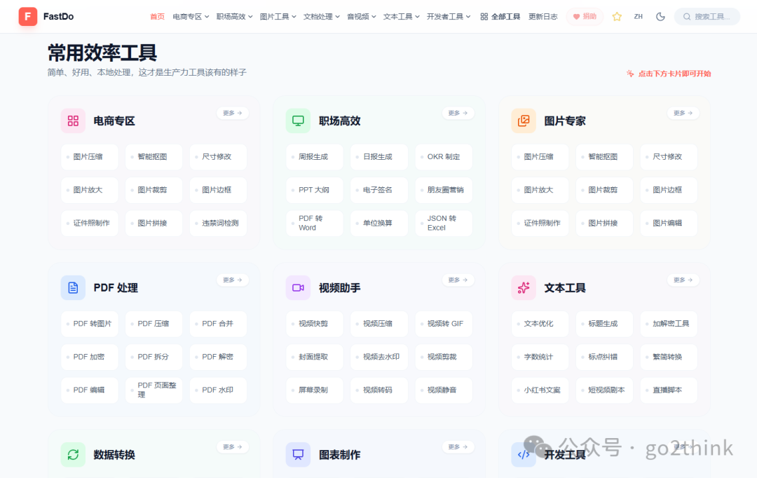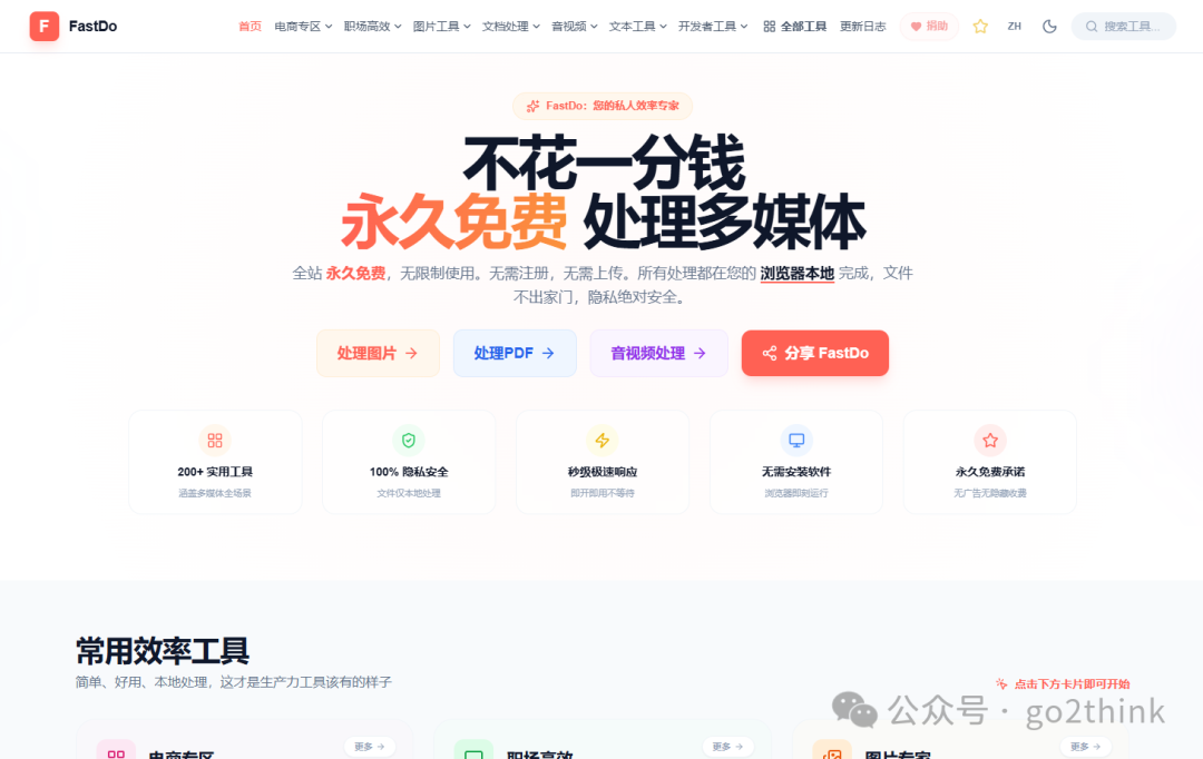 5、FastDo - 快做工具网站 https://fastdo.tools 永久免费的全能多媒体效率工具站,堪称办公创作神器! 全站 200+ 在线工具,覆盖图片处理、PDF 工具、音视频制作、文本处理、格式转换、图表制作、开发辅助等,全场景各种需求都能搞定。  而且永久免费,无需注册,无限制使用,所有处理均在浏览器本地完成,不上传文件,学生党、办公族、创作者、开发者都适配!