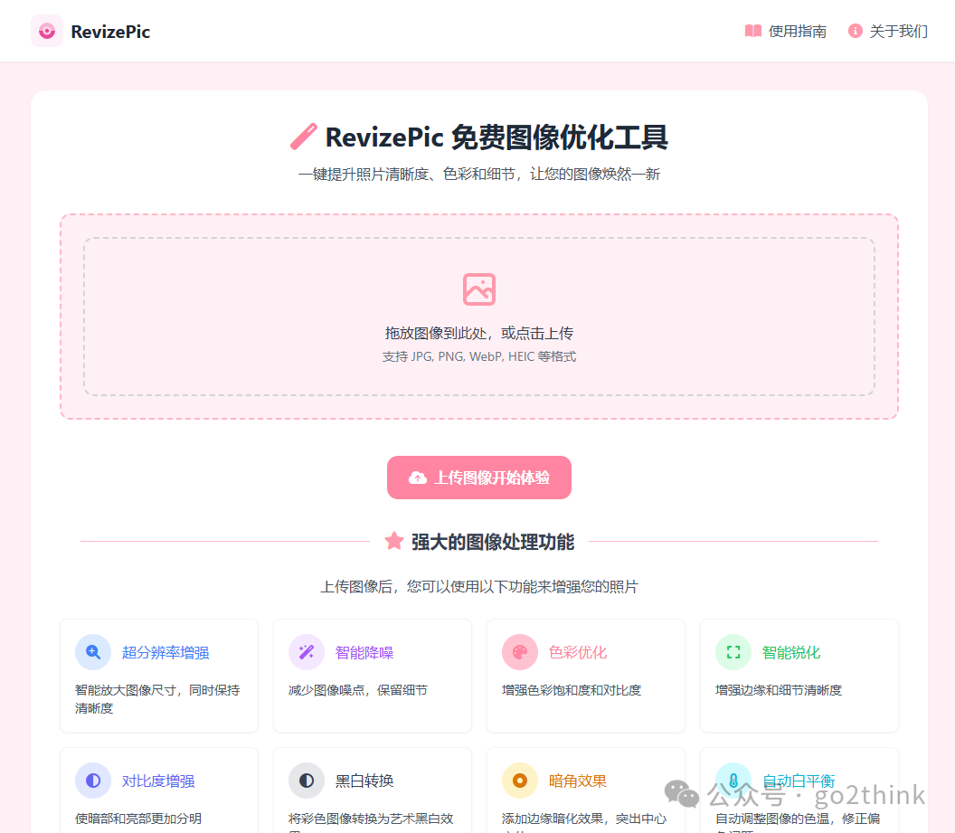 6、RevizePic https://revizepic.toolooz.com 一款强大而简单的在线图像优化工具,让图片焕然一新! 提供了 16 种图片处理功能,支持 JPG、PNG、WebP、HEIC 等多种格式。  超分辨率放大、智能降噪、色彩优化、HDR 效果、老照片修复、皮肤美化、水印移除等修图功能全覆盖。 所有处理都在浏览器本地完成,不上传服务器,隐私有保障,无需注册,修图小白也能轻松使用!