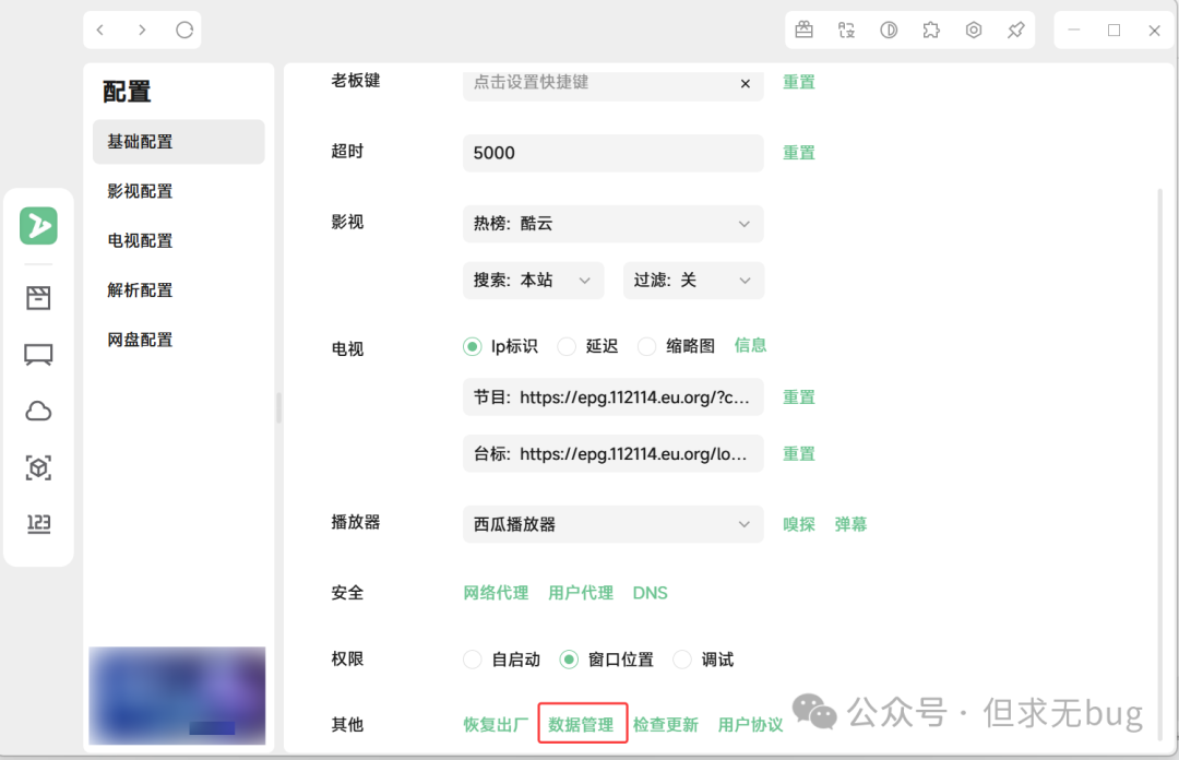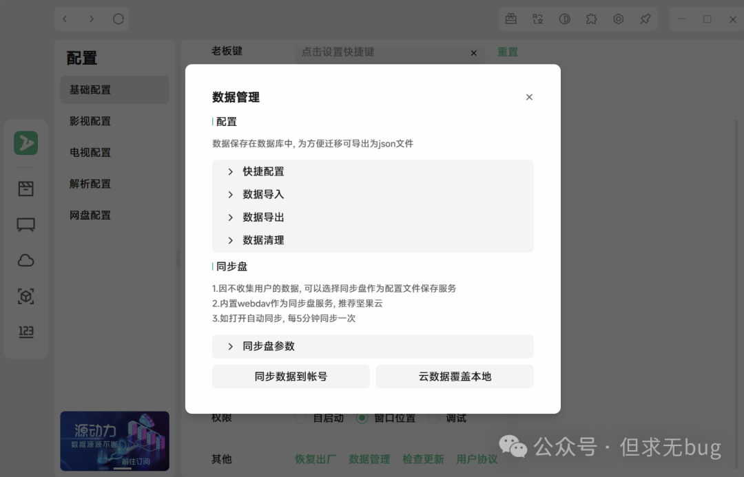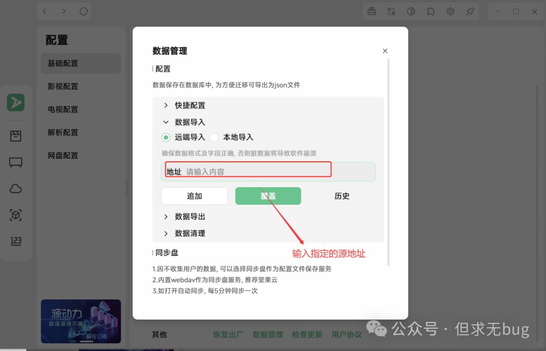 在配置页面选择“基本配置”后点击“数据管理”:  点击后弹出如下数据导入窗口:  接着点击“数据导入”后,在地址后面输入对应的源地址即可:  这里我给出一个源地址:https://cdn.jsdmirror.cn/gh/ls125781003/dmtg@master/zy.json,其本质是一个 GitHub 托管仓库的CDN地址:https://github.com/ls125781003/dmtg/blob/main/zy.json  粘贴后点击“覆盖”或“追加”即可。添加后便会将该源对应的视频源、IPTV源进行导入: