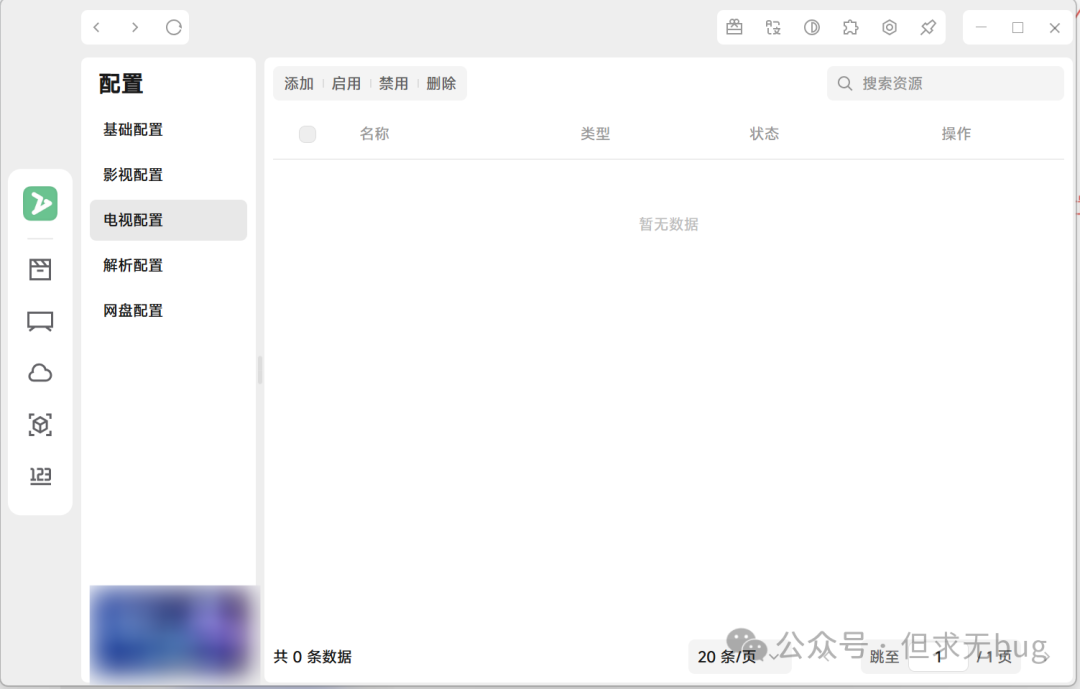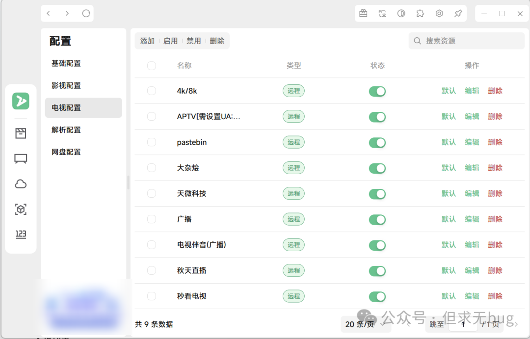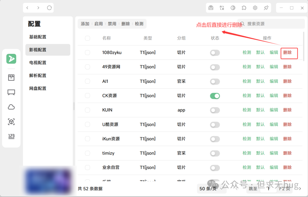 与检测类似,删除也仅以影视配置为例进行演示,其余选项大家自行尝试即可。所有操作均大同小异。 在影视配置页面,既可以直接点击配置项后面的“删除”:  也可以多选后,点击顶部的删除来进行批量删除:  删除后如下所示: