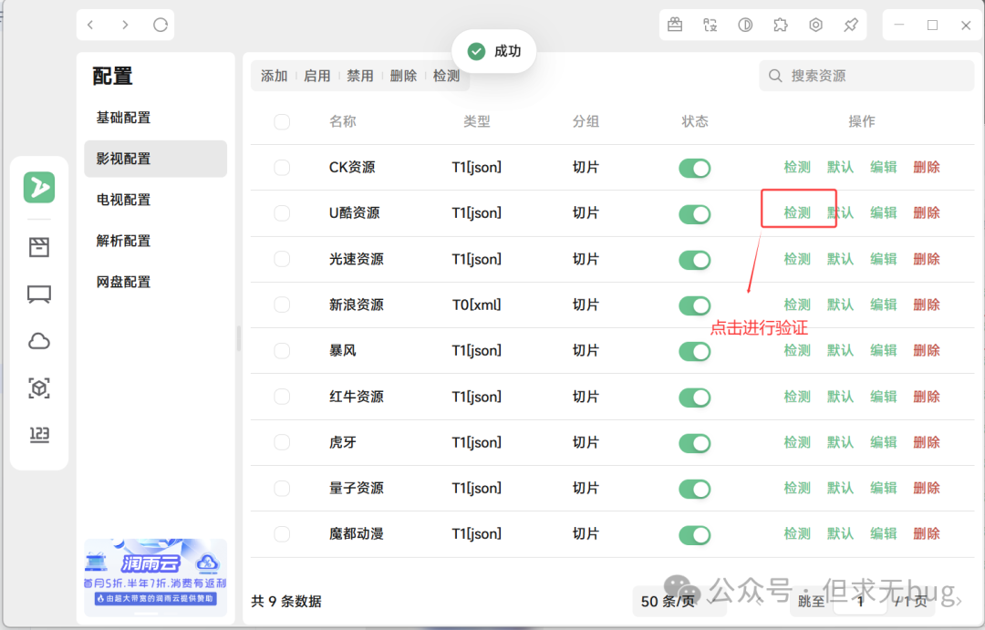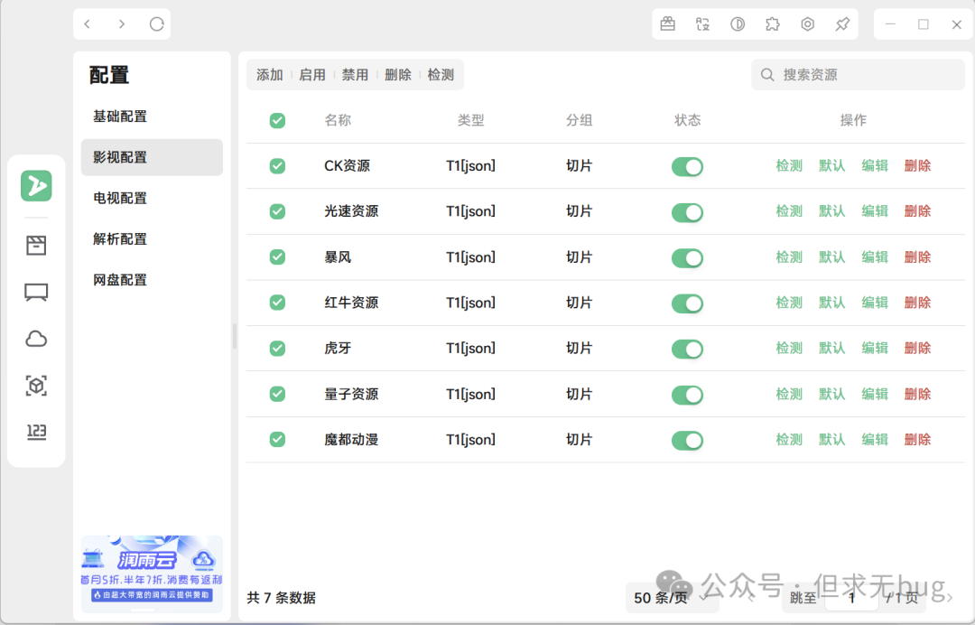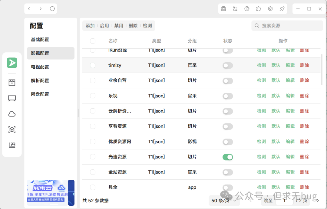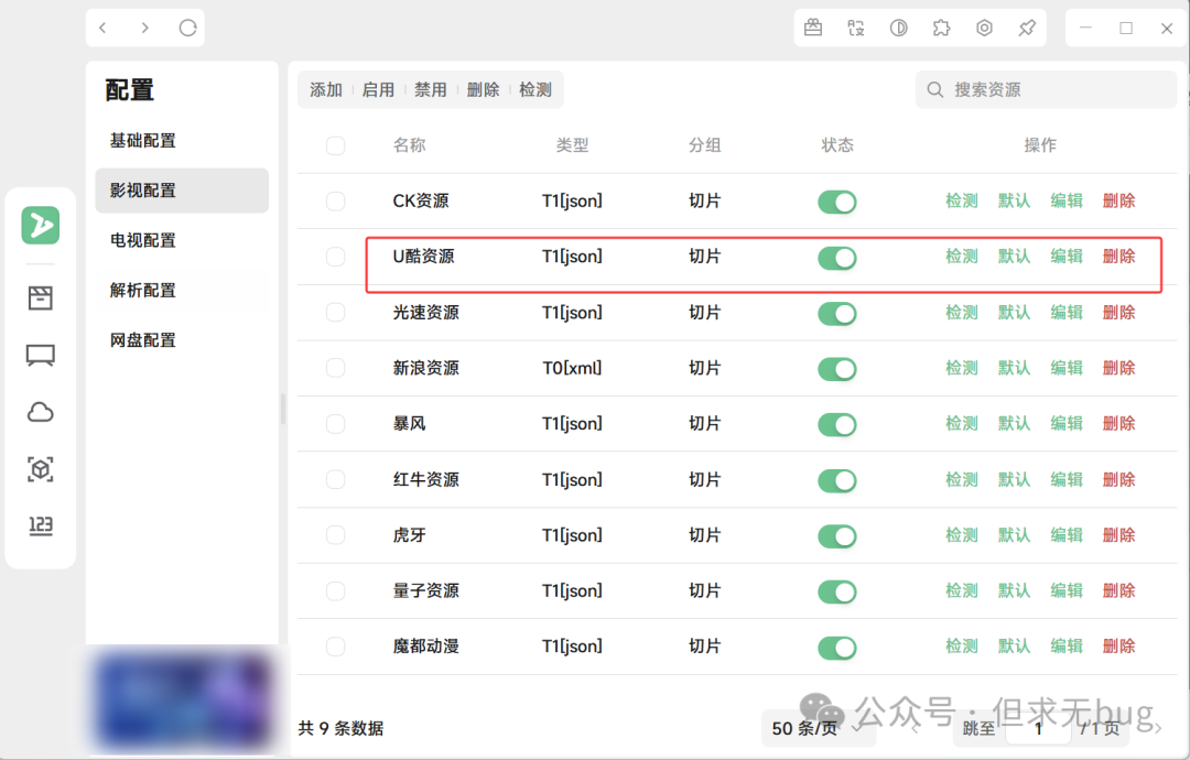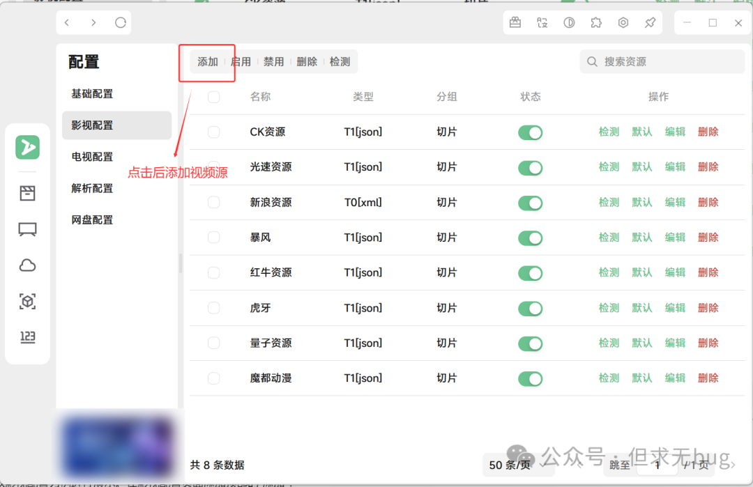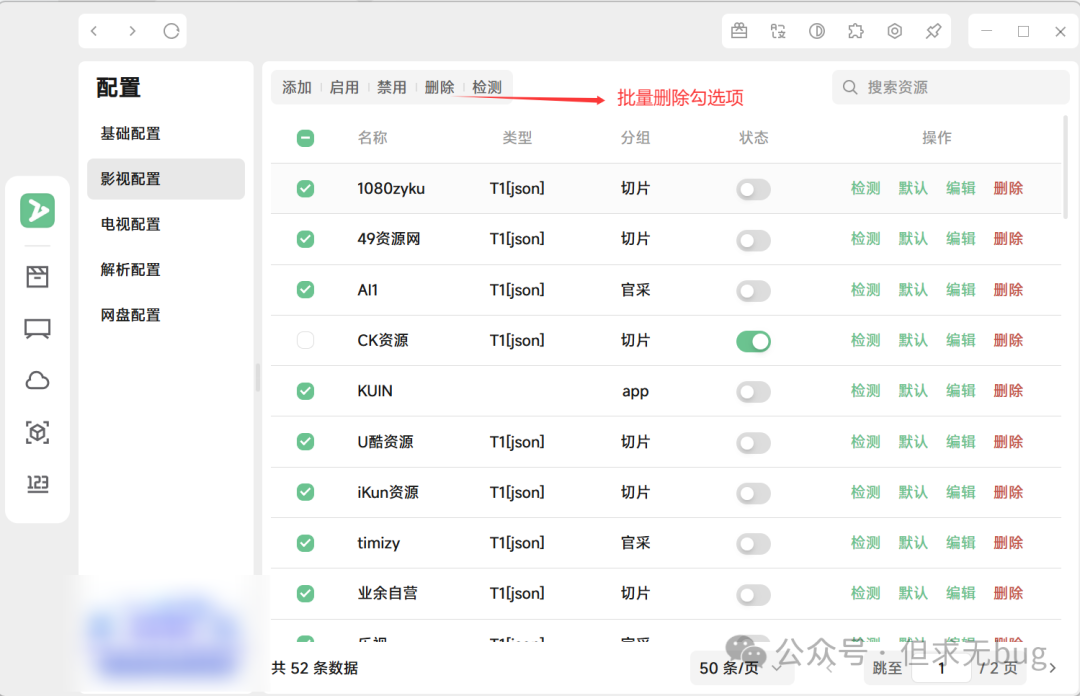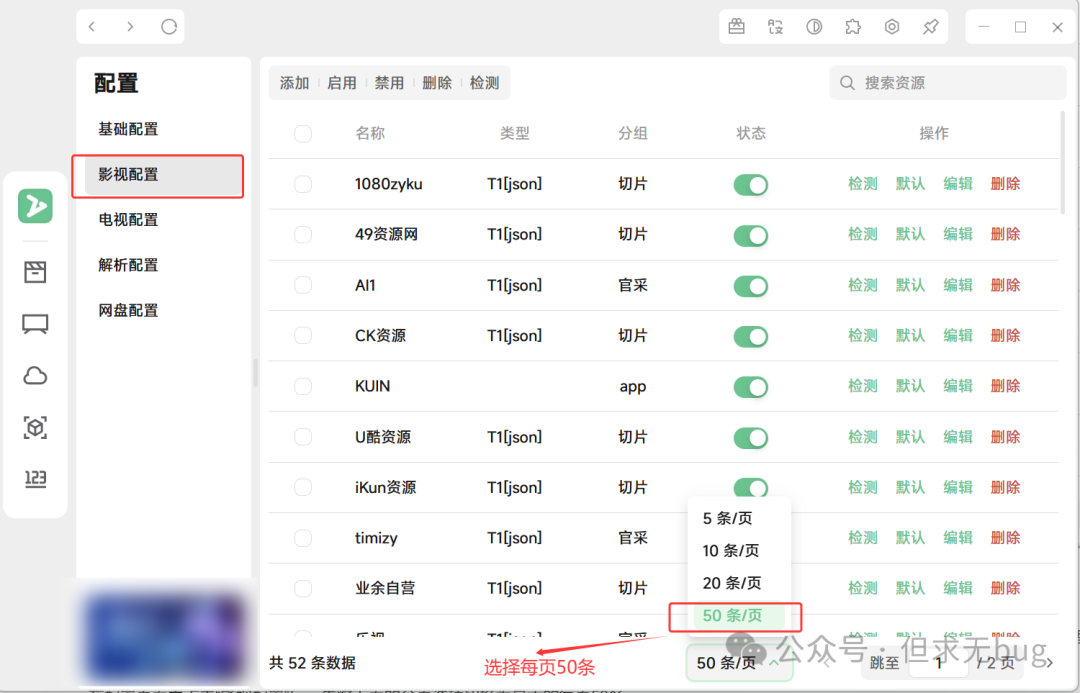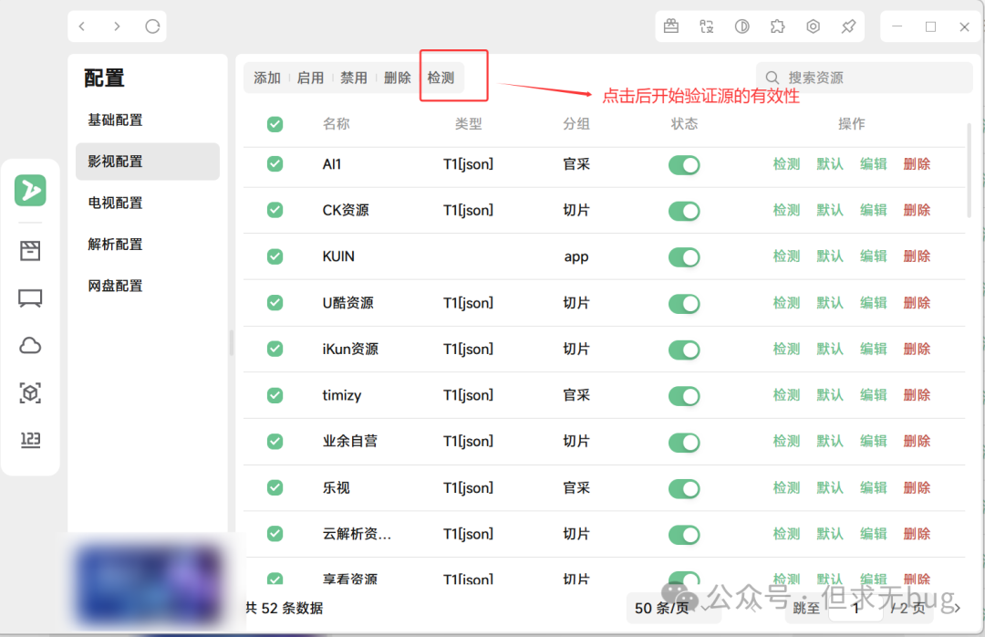 因为导入的源未必都是有效的源,因此需进行检测,以剔除失效的源。无论是影视、电视还是解析,检测的方式都大同小异,此处本人以影视配置的检测为例进行演示。其余配置大家自行尝试即可。 在配置页面中点击“影视配置”后,先将下面的分页选项切换为最大的每页50条:  接着点击名称前面的复选框来进行全选操作:  接着点击顶部的检测即可:  检测完毕后会自动将失效的链接进行禁用: