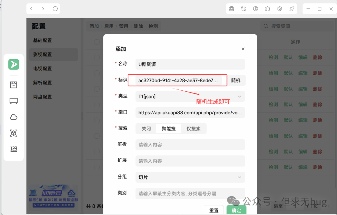 仍是以影视配置为例进行演示。在影视配置页面添加顶部的“添加”:  点击后弹出如下页面:  这里我给出一个测试的视频源:https://api.ukuapi88.com/api.php/provide/vod/at/xml,填写后如下所示:  点击“确定”便可进行保存,保存后如下所示:  当然,添加后可以点击后面的检测来验证该视频源是否有效: