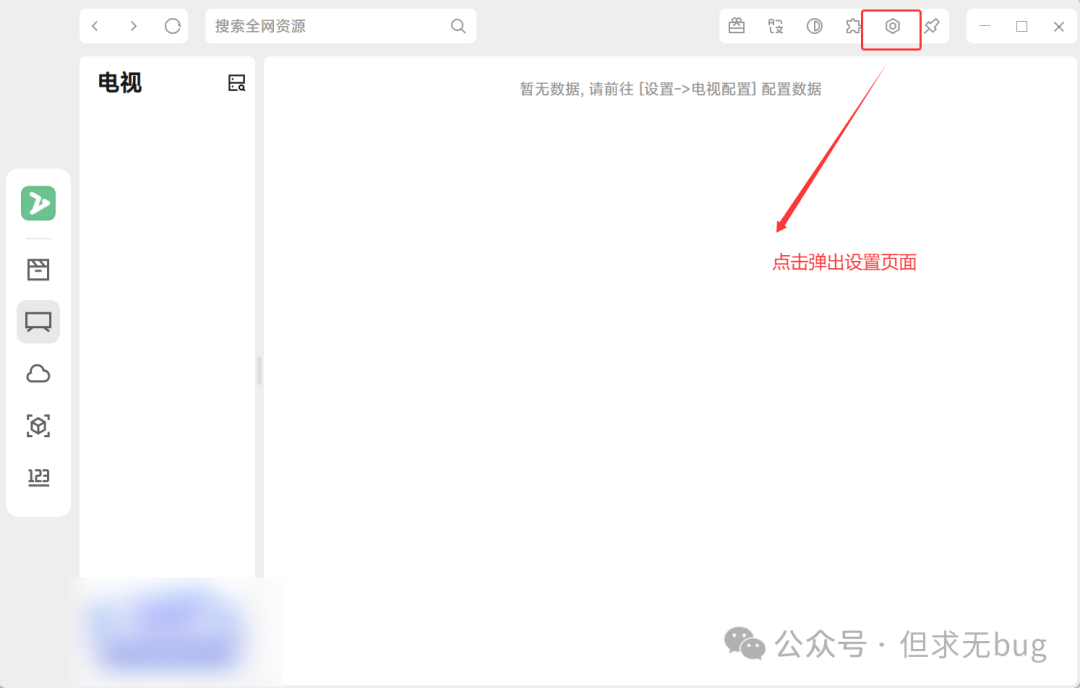 刚安装完毕的 ZyFun 只是一个空壳子,需配置对应的视频源后才能看相关视频。点击下图所示位置会打开设置页面:  打开的设置页面如下所示: